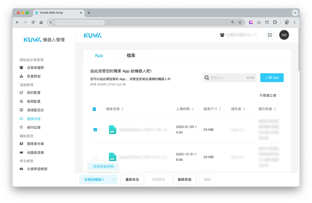 遠端管理 派發 App 與檔案 536 views 透過「檔案派發」能遠端安裝 App 或派發雲端開發工具的檔案到指定的機器人或裝置群組。 派發 App 操作步驟 至「檔案派發」 → 「App」 頁面,點擊「上傳 Apk」按鈕,從您的電腦中選擇 Apk 檔並上傳。勾選欲派發的檔案,再點擊畫面下方的「派發給機器人」畫面將出現裝置清單,可直接勾選裝置或搜尋裝置名稱,指定要接收的機器人後請按下「發送」機器人端將會開始安裝 App 於功能選單畫面。 排程 App 安裝時間 Apk 在派發到機器人的當下就會開始進行安裝,若您不想讓機器人正在進行的工作被打斷時,您可以選擇「排程派發」,讓 Apk 預先派發到機器人上,等待您指定的時機後再開始安裝。我們提供以下兩種方法: ① 排程安裝時間您可以設定這個 App 派發行程只在某個時間段安裝,排程後 App 會預先派發到機器人上直到派發時間到觸發安裝,若機器人在安裝時間關機導致安裝失敗,將會於隔天同一時間再次進行安裝。 ② 依照 App 指令更新(進階)此安裝方式適用有開發經驗的使用者,請在您開發的 App 內下達更新指令 派發檔案操作步驟 至「檔案派發」 → 「檔案」 頁面,點擊「新增檔案」按鈕,從您的電腦中選擇檔案並上傳。勾選欲派發的檔案,再點擊畫面下方的「派發給機器人」畫面將出現裝置清單,可直接勾選裝置或搜尋裝置名稱,指定要接收的機器人後請按下「發送」可依照下表所提示的位置到機器人端開啟檔案。 檔案格式規則 女媧雲端開發工具 目前機器人管理系統可派發:程式實驗室&內容編輯器的素材檔,派發後請依照下表於機器人端開啟檔案 開發工具名稱 檔案格式 機器人端開啟位置 / 應用程式 內容編輯器 程式實驗室(mbkx) 程式實驗室 Air 程式實驗室 內容編輯器(mbtx) 檔案管理 多媒體檔案格式 將檔案派發到機器人,可以透過內建的播放器播放多種影片、音樂及影像格式 派發檔案格式 機器人端開啟位置 影像格式 (.Jpg/.Jpeg/.Png/.Gif) 檔案管理 音訊格式 (.Mp3/.M4a/.Wav) 檔案管理 視訊格式 (.Mp4/.Mov) 檔案管理 應用程式 開發工具名稱 機器人端開啟位置 / 應用程式 應用程式 ( .Apk ) 程式清單 ← 上一篇:我的配置 前往閱讀:遠端監控台
