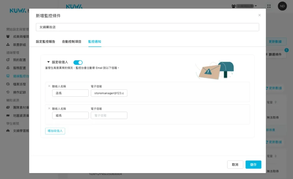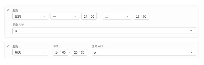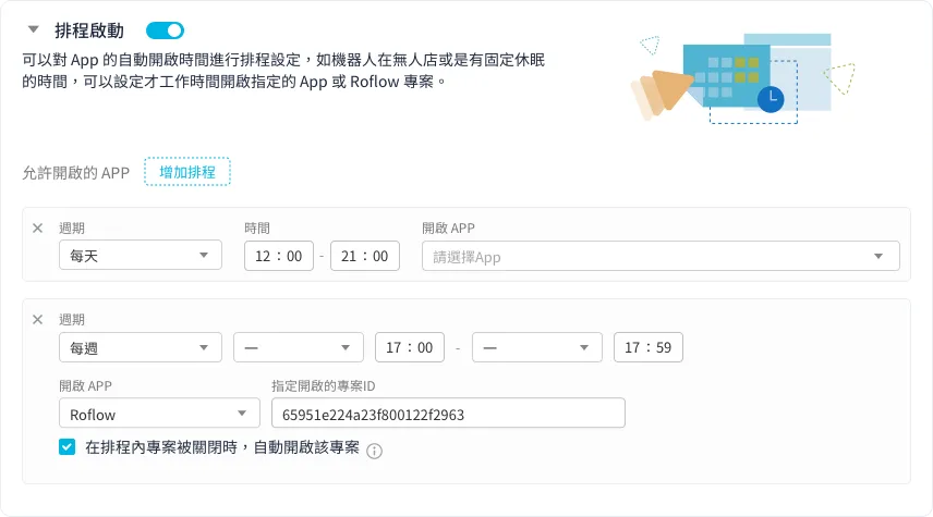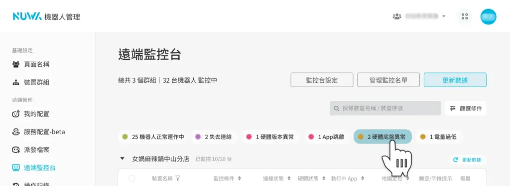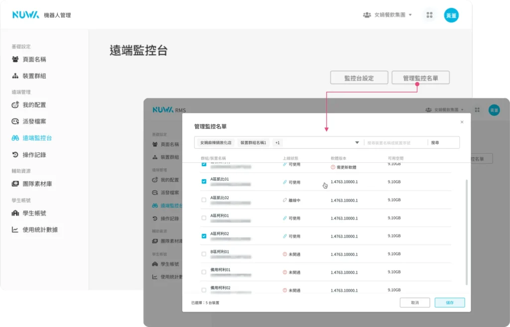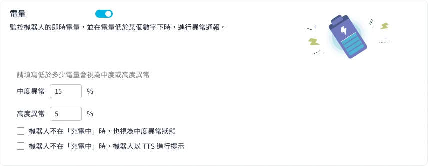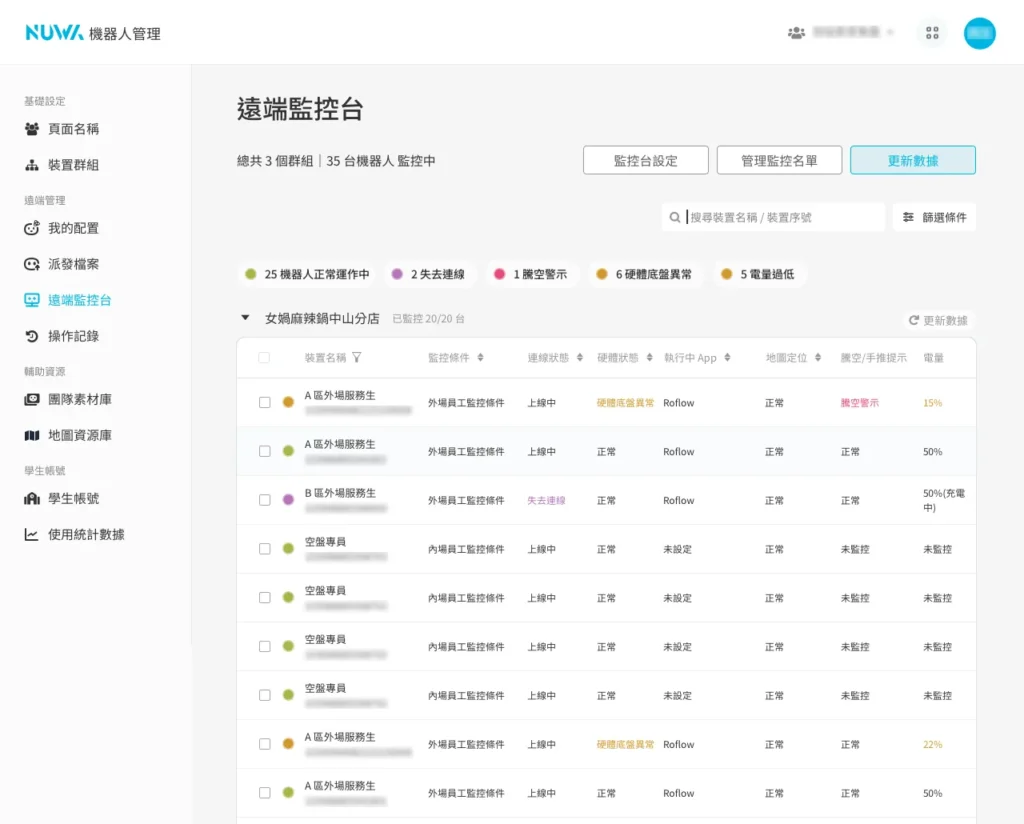 遠端管理 遠端監控台 492 views 只要使用遠端監控台,就能在線上查看遠端多台機器人當下的工作狀態,並即時排除錯誤或異常。使用遠端監控台前,請務必請務必將機器人更新到最新的版本 Kebbi 系列機器人:OS12.3 以上Collibot 服務型系列機器人:OS1.5.2 以上 開始監控 開始監控機器人前,首先要設定兩個重要項目:「管理監控名單」以及「設立監控條件」。完成後,就可以開始使用遠端監控台了! 一、管理監控名單 選取團隊內要進行監控的裝置,只有被加入監控名單的裝置才會開始被監控。請由畫面右上角「管理監控名單」按鈕進入,管理此名單。 如裝置的軟體版本不支援「遠端監控台」,於機器人軟體版本的下方會出現軟體版本不相容的提示,需要先更新版本才能加入監控清單。 當裝置長期處於離線狀態,RMS 則無法辨識該軟體版本。您一樣可以先加入監控清單,在裝置上線後,監控台會提示您應該先更新再繼續使用。❊ 裝置未登入「檔案管理」App 時,無論上線或離線,都無法加入監控清單中。 加入監控名單的裝置,將會以群組排列展示在「遠端監控台」的頁面上,並套用預設的監控條件。「預設監控條件」會監控裝置最基本的「連線」及「硬體」狀況。❊「預設監控條件」會監控裝置最基本的「連線」及「硬體」狀況。 若有特殊的監控管理需求,請參見下一步:設定監控條件。 二、設立監控條件 在監控清單中,我們可以點擊「監控台設定」按鈕來套用或建立新的監控條件。 監控條件 監控報告分為三種類型:「設定監控報告」、「自動控制項目」、「監控通知」設定監控報告 內的項目,可以監控機器人的各項軟硬體是否出現異常狀態。自動控制項目 則是可以在遠端主動控制機器人的各種設定值,讓機器人端不會被任意修改。監控通知 可以記錄機器人的操作狀態、異常狀態,並將監控的結果通知給收件人。 1、設定監控報告 連線狀態( 必選 )被監控裝置連線到遠端監控台的狀態,若發生異常,可能是裝置失去網路連線、關機中或發生其他異常。❊ 當失去連線時,遠端監控台即無法控制遠端的裝置。 硬體狀態被監控裝置的韌體與馬達狀態,監控硬體版本、關節馬達與底盤。 電量:可以檢視被監控裝置的電池電量,並設定電量低於多少數值時,會展示「中度異常」以及「高度異常」。勾選「機器人不在充電中時,以 TTS 進行提示」後,當檢查到機器人沒有插著充電線時,就會以 1 分鐘一次的頻率發出「請幫我充電線」的 TTS 提示。❊ 由於持續監控電量對機器人的讀取資料負擔非常大,所以在正常電量的狀況下,我們將會減少更新電量的資料讀取 監控中可使用的APP您可以設定套用此監控項目的機器人能執行哪些 App,也就是白名單機制。若畫面跳離指定的 App,將會收到系統的異常通知。也能進階使用自訂按鈕,遠端開啟指定的 App,讓機器人回去執行應有的工作任務。* 我沒有將 App 加入白名單,卻沒有異常提示?Roflow 是一套可以串連各種 App 為流程模組的工具,當執行 Roflow 專案時,可能會開啟其他輔助的 App 或因流程需要,暫時轉至其他工具上。因此在監控這個項目時,部分輔助 App 會自動被設定在白名單中,例如:機器人媒體播放器(媒體與工具模組用)、相機鏡頭(物件辨識模組用)等。 Kebbi 系列機器人專屬監控項目 騰空警示:當機器人被抬起、傾斜或倒地持續 1 分鐘以上,遠端監控台發出「高度異常」的警示。 Collibot 服務型系列機器人專屬監控項目 手推模式( 必選 ):機器人手推模式被開啟時,遠端監控台會展示此狀態,當機器人無法繼續執行工作或移動時,可以檢查是否因為沒有結束手推模式造成機器人被鎖定的狀態。 擴充機器人:開啟後,當監控到柯利堡與擴充的凱比機器人連線配對中斷時,將會以「擴充機器人未連線」於監控台發送異常提示 地圖定位:可以設定一張地圖作為機器人的白名單地圖,當機器人沒有開啟正確地圖、地圖遺失或定位有誤時,會對遠端監控台發送對應的錯誤狀態。 2、監控條件-自動控制項目 軟體更新排程:排程後可以讓您的機器人自動檢查是否有最新版本,並依照設定的時間進行更新。❊ 請注意,只有在機器人接上電源時才會進行更新,如在更新的時段內沒有接上電源,將會於下一次排程再次進行更新。 排程啟動:以星期或日為單位進行排程,設定在固定的時段自動開啟 App 或 Roflow 指定專案,搭配「待機階段」監控項目一同使用,可達成機器人休眠時間結束後,自動恢復工作模式的效果。▸ 自動開啟專案: 如果排程開啟的是 Roflow 專案,可以勾選檢查到機器人沒有在排程內開啟此專案時就自動重新啟動。▸ 設定注意事項:勾選自動重新啟動後機器人端就無法任意結束專案,直到修改監控條件。排程不可與待機與排程更新時段重疊。當排程中發生每天與每週的時段衝突時,會優先執行每週的排程。以下圖設定為例: ▸ 每天 14:00 – 20:30 要開啟 AppA,但每週二 14:00-17:00 要改開啟 AppB▸ 週二 17:01 週二的排程結束了,因為每天 14:00 – 20:30 的排程還在時間內,需要排程開啟一次 AppA 音量大小開啟監控後,機器人的音量大小將固定在遠端設定的數值,無法在機器人端隨意被調整。 螢幕亮度開啟監控後,機器人的螢幕亮度將固定在遠端設定的數值,無法在機器人端隨意被調整。 Kebbi 系列機器人專屬監控項目 待機階段:可以選擇「機器人在任何時候都不