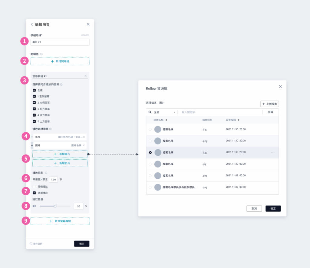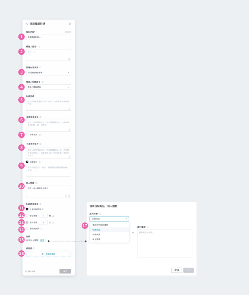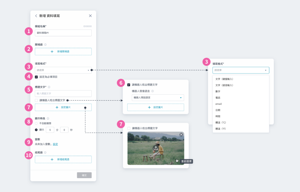 ① 模組名稱:會顯⽰在模組卡片上,可⾃訂名稱⽅便識別 ② 開場語:設定⼀到多個開場語,讓機器⼈依序說出 ③ 套用 (apply):選擇本模組欲套用的 API。套用前,請先至資源庫新增 API 資料 套用後,根據 API 的請求方式為 POST/GET,進行不同設定 ④ 套用 API (POST):需設定 Header, Body ⑤ 套用 API (GET):需設定 Header, Params ⑥ 移Header:勾選欲套用的 Header。此處帶入已設定的 KEY,並可設定 VALUE ⑦ Body:輸入 JSON 格式或加入變數,可點擊右下角按鈕 </> 來格式化 JSON 文本 ⑧ Params:勾選欲套用的 Params。此處帶入已設定的 KEY,並可設定 VALUE