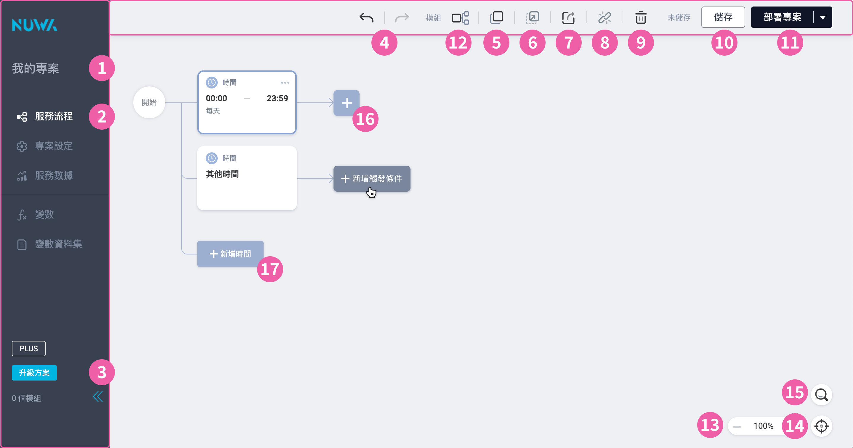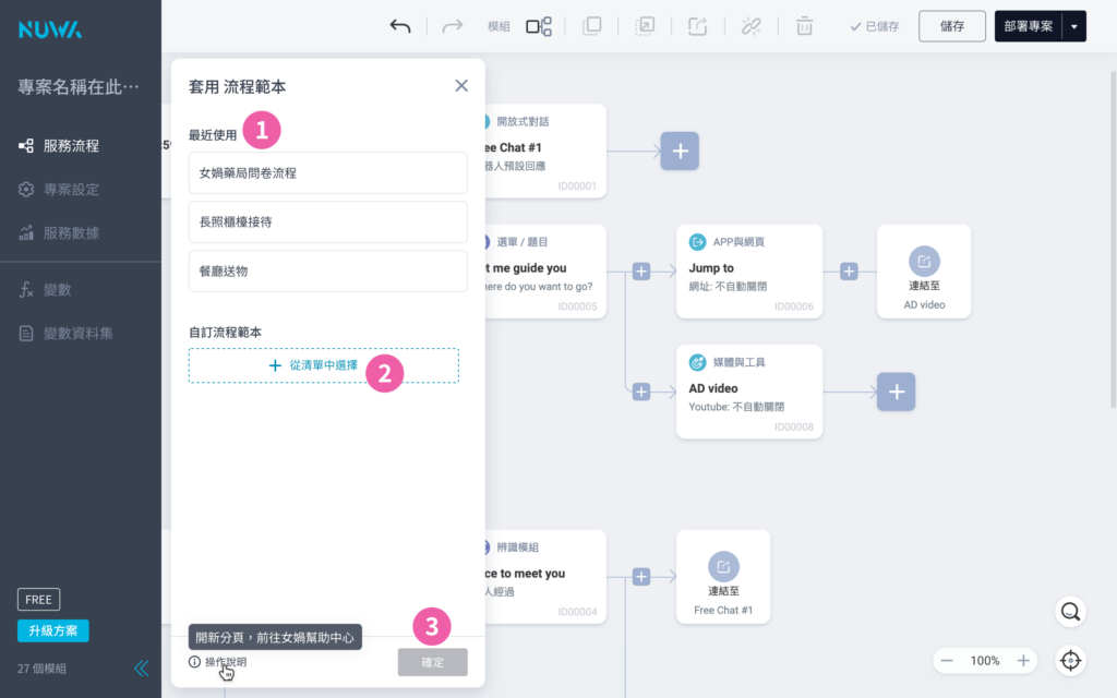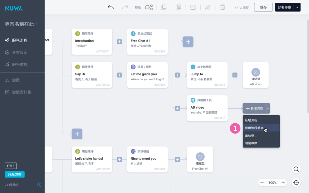 Roflow 開始使⽤ Roflow 394 views 建立新專案 從女媧⽤⼾中⼼進入 Roflow ⾸⾴後,須新增專案來開始使⽤。您可以新增「① 空⽩專案」,或依您的服務類型「② 選擇模板」來新增;以模板新增後,將有⼀份預先設計好的服務流程樣板,可直接編輯使⽤。根據使⽤的⼯具⽅案,您可在 Roflow 新增⼀到多個專案。 不論是否選⽤模板,皆須在新增專案前進⾏基本設定: ① 專案名稱(必填)預設帶入所選模板類型之名稱,您可以修改為⾃訂名稱,以便後續管理專案。 ② 機器⼈型號(必填)根據您⼿邊的機器⼈來選擇;不同機器⼈型號,可⽀援不同功能。型號有三種:Kebbi Air、Kebbi Air S / RobotCreator、RobotCreator DX。⚠ 請注意,務必搭配對應的硬體型號來使⽤,否則在機器⼈上將無法順利運作。 ③ 機器⼈臉譜預設提供三個基本⾓⾊,若您的機器⼈型號是「Robot Creator DX」則有五個基本⾓⾊可選擇。想⾃⼰發揮創意嗎?若您有購買「臉譜編輯器*」⼯具,也可點擊+號來選擇您已建立的臉譜。*臉譜編輯器:女媧的雲端商務⼯具之⼀,可⾃由創造個⼈化臉譜。若您有購買此⼯具,就能將⾃⼰創造的臉譜加入 Roflow 來使⽤囉。 ④ 機器⼈說話語氣展開「更多設定」來做選擇。共有五種語氣:⼀般、朝氣、專業、頑⽪、愉悅,還能選擇語⾳引擎來試聽!由於機器⼈⽀援的語⾳引擎,將根據型號⽽有所不同,因此最終仍須以您的機器⼈所⽀援的語音引擎為準。 ⑤ 我之後想變更設定除了機器人型號有部分限制,所有設定皆可在「專案設定」中的「機器人設定」進行編輯。若新增專案時,選擇機器人型號 Collibot,則新增後將不可改為其他型號;若新增專案時選擇「非 Collibot 型號」,則新增後也不可改為 Collibot 型號。 ⑥ 選擇機型(Collibot):擴充機器人支援機器人動作,並可於機器人螢幕/底車平板分別設定播放內容;無擴充機器人則不支援機器人動作,所有畫面將在平板播放。 ⑦ 專案地圖(Collibot):若選擇「使用機器人地圖」,可參考將執行專案的機器人其搭載的地圖來自訂地標名稱,若多台機器人搭載的地圖皆有相同地標,則同一個專案將可泛用至不同機器人,不需分別下載/變更專案地圖。若選擇「指定地圖」,則需先於資源庫下載地圖,設定時只能選擇該地圖中存在的地標。 設定服務流程與時段 ⼀套完整的服務,是由⼀個個單點的服務環節串連起來。——透過 Nuwa Roflow,每個環節將化為「模組」,由左⾄右依序排列,組合成⼀個服務流程。您可以讓機器⼈在不同時段,以指定觸發⽅式來感知顧客、進⾏互動;每個時段可新增⼀到多個流程,並可依不同的互動需求來選擇模組。 新增專案後,點擊服務流程畫布左上⾓的「開始」來設定時段。可指定每天固定時段,或勾選指定⽇期來設定⽇期/時段區間。 新增流程與模組 時段設定完成後,即可開始製作流程,點擊畫布上的「⑮+號按鈕」,新增觸發條件模組。服務流程⼯作區分為三⼤區塊:側邊導航欄、⼯具列與流程畫布區。 側邊導航欄 ① ⽬前編輯專案的名稱② ⾴籤,點擊切換專案中的⼦⾴⾯:服務流程、專案設定、服務數據、變數、變數資料集③ 點擊箭頭圖⽰,可展開/收合側邊導航欄 ⼯具列 ④ 復原(Ctrl Z / ⌘ Z)/ 取消復原(Ctrl Shift Z/ ⌘ Shift Z)編輯,⽀援快捷鍵操作⑤ 複製模組⑥ 移動模組⑦ 連結⾄ (某個模組)⑧ 斷開流程⑨ 刪除(delete),⽀援鍵盤操作⑩ 儲存專案,⽀援每 5 分鐘⾃動儲存/⼿動儲存⑪ 部署專案,將專案部署⾄機器⼈。詳見:部屬專案⑫ 流程範本,選取專案中的多個連續模組,儲存為可重複使用的範本。詳見:流程範本*⑤~⑨ 為模組編輯功能,選取模組卡片時⽅可執⾏。 流程畫布區 ⑬ 畫布瀏覽- 比例與縮放⑭ 畫布瀏覽- 重新定位,⽀援快捷鍵操作 Ctrl+0 / ⌘+0⑮ 搜尋模組(Ctrl F / ⌘ F),輸入模組名稱關鍵字或模組 ID 來搜尋並定位模組;或切換至「尋找與取代」頁籤,輸入關鍵字搜尋模組內容,替換為不同文案。*可以被尋找與取代的欄位僅限:TTS 輸入框、模組名稱、模組標題文字、分流模組的選項文字 ⑯ 新增觸發條件 / 新增流程 / 連結至… / 關閉專案⑰ 新增時間,可編輯 / 設定新時段 工具列 | 流程範本 您可以選取當前專案中的多個連續模組,儲存為可重複使用的「流程範本」。建立一次,即可在任何專案中輕鬆套用,減少重複動作的時間、提升做專案的效率。如何建立流程範本:1. 點擊工具列中的①「建立流程範本」按鈕 2. 進入建立模式後,您可以開始選取想要作為範本的模組群 ① 教學視窗:提供建立流程範本的詳細說明,包括建立步驟、規則,以及模組群的選取方式。② 操作教學:點擊此按鈕即可開啟①教學視窗。③ 選取畫布:畫布會切換為選取模式,您可以直接點選要納入流程範本的模組群。④ 下一步:選取完成後,點擊此按鈕以進入流程範本的設定階段。 3. 設定流程範本資訊 進入設定頁面後,您可以填寫下列項目:① 流程範本名稱:為此流程範本命名,方便識別與搜尋。② 流程範本描述:簡要說明此範本的用途,讓團隊成員更容易理解其功能與適用情境。③ 共用設定:選擇要共用給哪些群組,並設定各群組的使用權限。完成上述設定後,請點選右下角的「建立」按鈕,即可完成流程範本的建立。 如何套用流程範本:在專案中,點擊模組後方的空白分支,選擇①「套用流程範本」。 2. 選擇要套用的流程範本: ① 最近使用:您可以在此區域選擇最近建立、套用